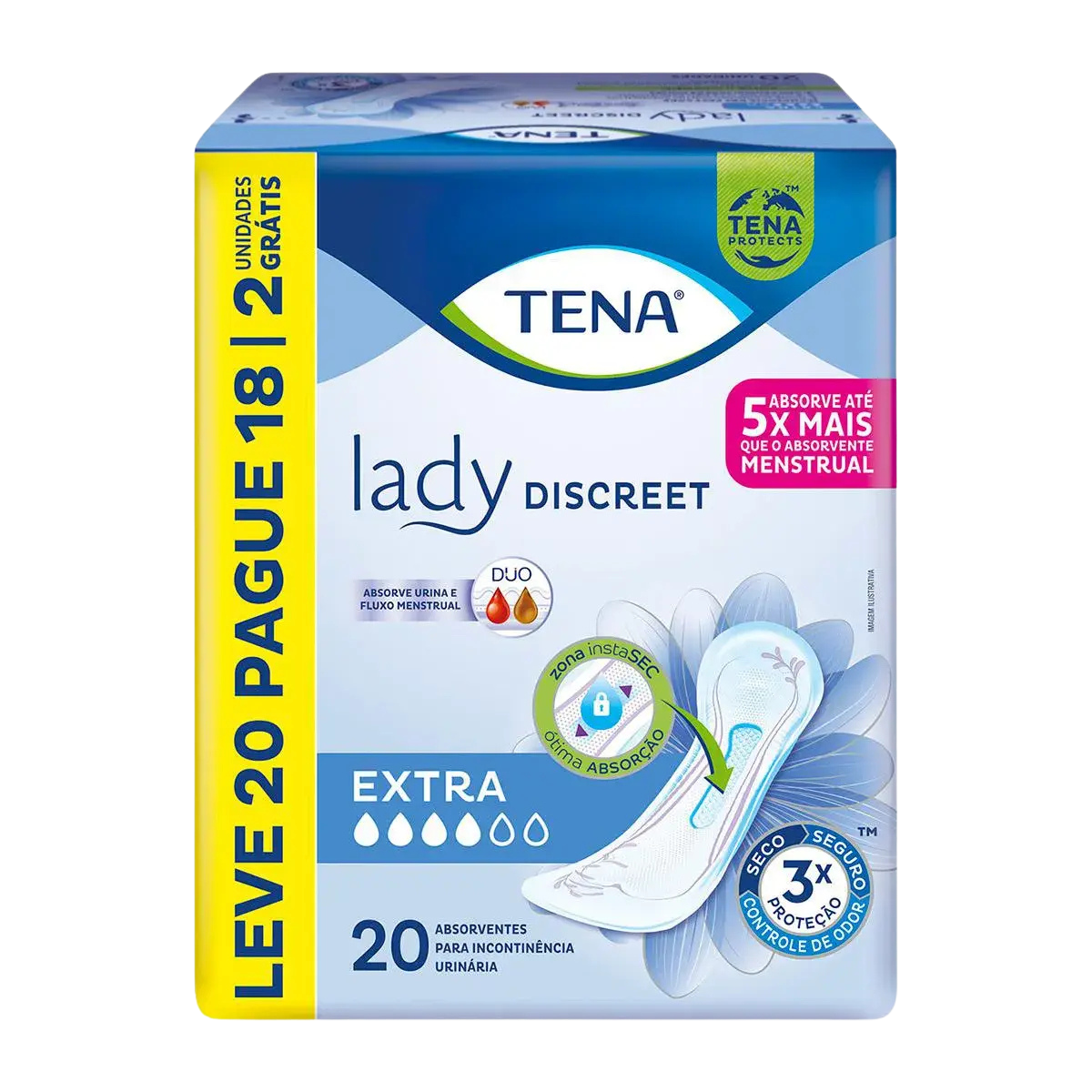 O Tena Lady Discreet Extra é um absorvente íntimo feminino que, diferente dos convencionais, pode ser usado não só em casos de incontinência urinária, mas, também, durante o fluxo menstrual, oferecendo proteção e conforto no dia a dia.
