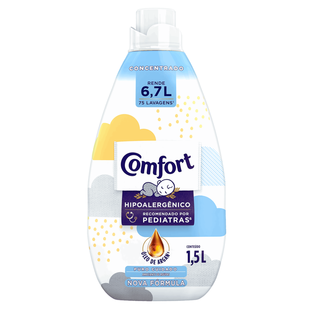 Amaciante para Roupas Concentrado e Hipoalergênico, da marca Comfort, em embalagem com 1,5 litro. Dermatologicamente testado, é um produto desenvolvido para proporcionar suavidade e frescor nos cuidados e na higienização de roupas para bebês, sendo também recomendado para pessoas que possuam sensibilidade. Na versão Puro Cuidado, conta com Óleo de Argan em sua fórmula. Com perfume delicado, traz notas suaves de talco. Pode ser utilizado na lavagem de peças brancas e coloridas. Apresenta ótimo rendimento, bastando menos de meia tampinha para atingir o resultado desejado. Antes de utilizá-lo, as instruções do rótulo devem ser consultadas. É recomendado que seja mantido em local seco e fresco, longe da umidade e da incidência de luz solar direta, e fora do alcance de crianças e de animais domésticos.