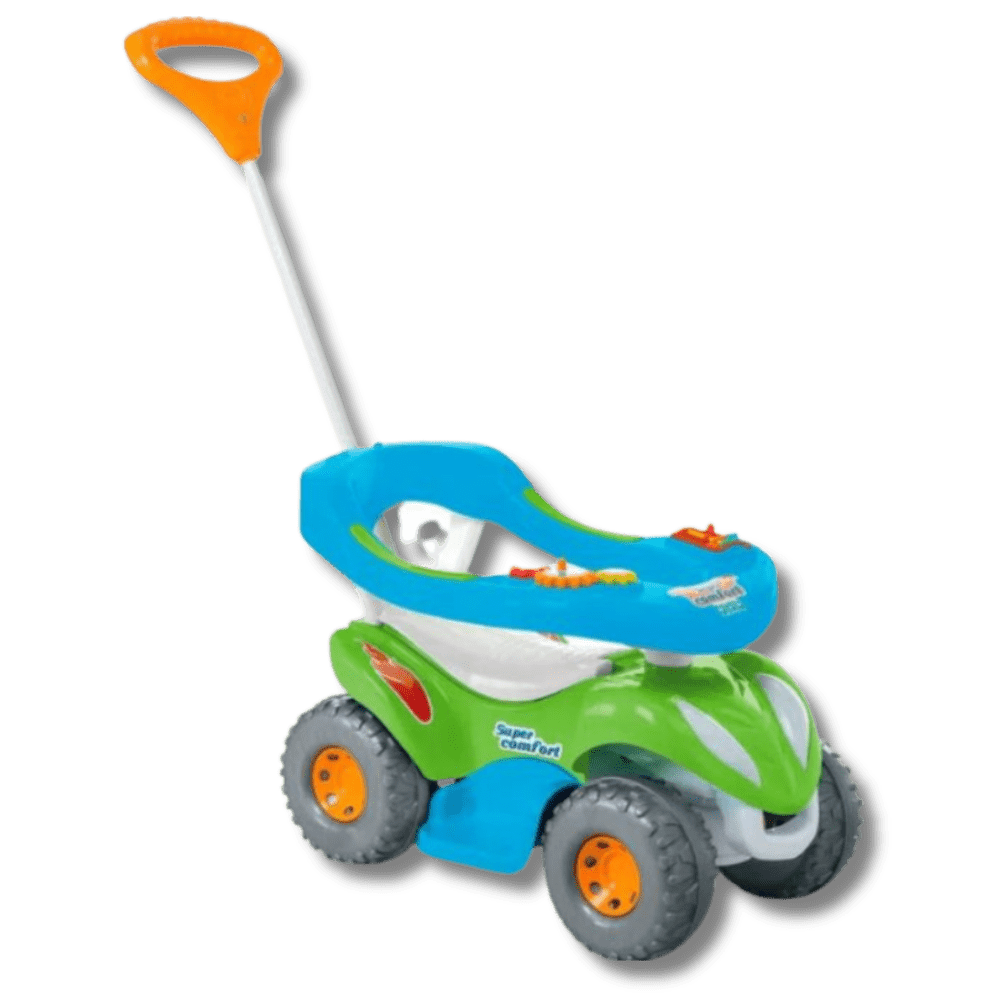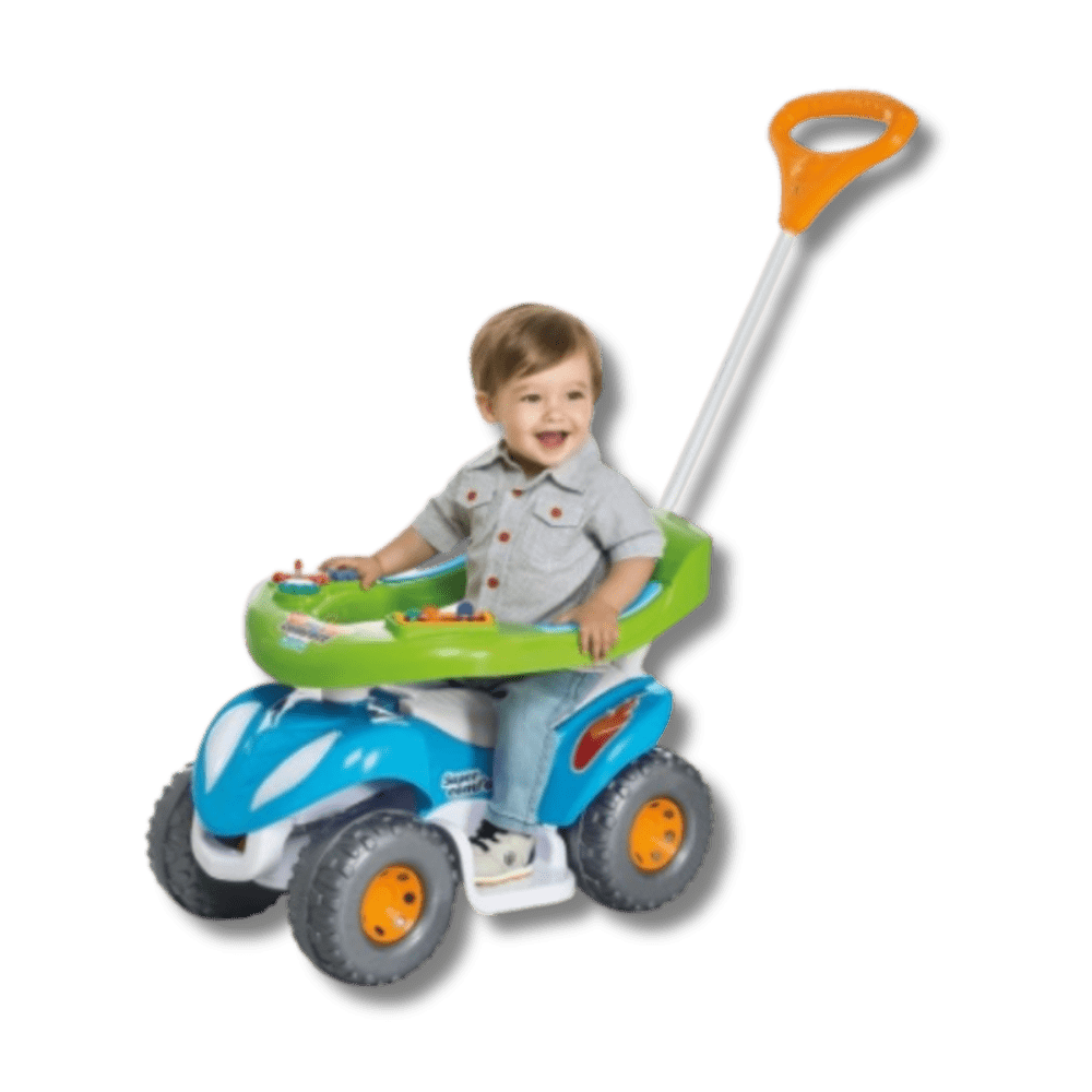 Para um passeio super confortável e divertido! O carrinho super colorido é confortável e seguro para passear ao encaixar o cabo. Enquanto passeia, o bebê pode se divertir com as atividades didáticas no aro protetor. E é um brinquedo 2 em 1! Retirando a proteção e o apoio para os pés, o volante gira e o bebê pode brincar desenvolvendo a coordenação dos movimentos e impulso. O carrinho tem buzina e o assento ainda levanta para guardar acessórios e brinquedos.