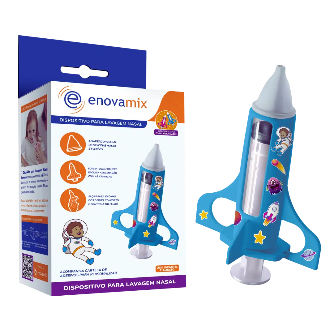 O Dispositivo para Lavagem Nasal Enovamix é um condutor de líquidos para higienização nasal, tem capacidade de até 20 ml de solução e remove suavemente o excesso de secreções nasais. Eficaz para todas as idades, possui adaptador nasal em silicone macio e flexível, oferece proteção e conforto durante a lavagem nasal. O Dispositivo para Lavagem Nasal Enovamix, tem o formato de foguete para facilitar o uso em crianças. Com alças anatômicas para encaixe dos dedos, auxiliam na aplicação e controle do fluxo de solução. Acompanha adesivos para personalizar e tornar a limpeza nasal mais divertida. A lavagem nasal ajuda previnir infecções respiratórias, alergias e outras complicações além de aliviar congestões nasais e desconfortos na respiração, deixando o nariz limpo e livre de secreções. Sua indicação deve ser de acordo com a orientação de um médico ou especialista.