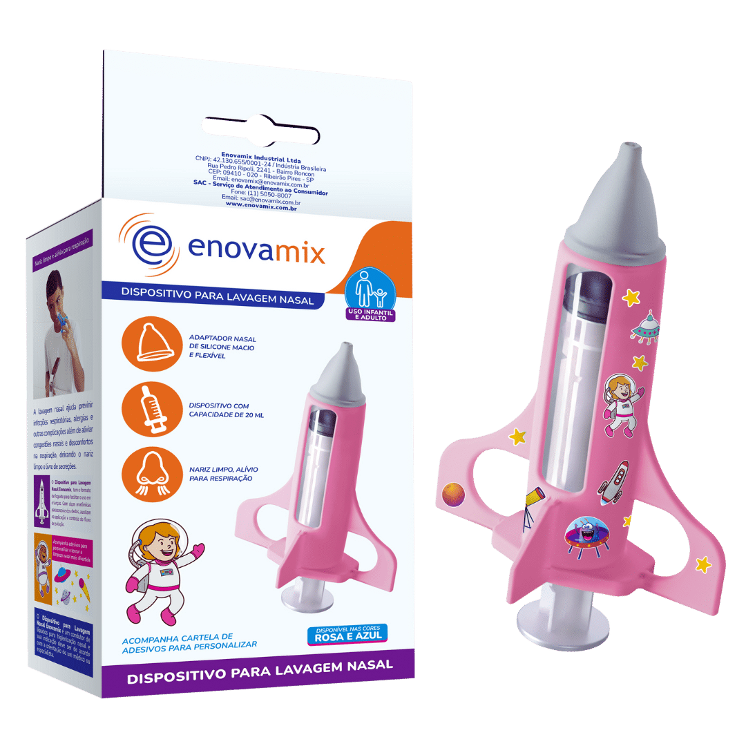 O Dispositivo para Lavagem Nasal Enovamix desobstrui e limpa as vias nasais removendo de forma eficaz as impurezas. Alivia as congestões nasais e desconfortos na respiração, deixando o nariz limpo e livre de secreções. Ajuda a prevenir infecções respiratórias, alergias e outras complicações. Principais características: Adaptador nasal de silicone: macio e flexível | Formato de foguete: facilita a interação com as crianças | Alças para encaixe dos dedos: conforto e controle do fluxo. Acompanha cartela de adesivos para personalizar.