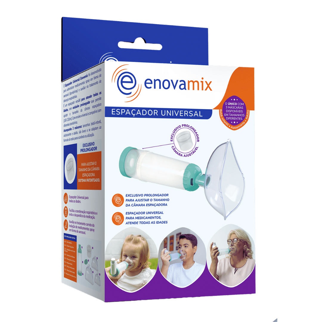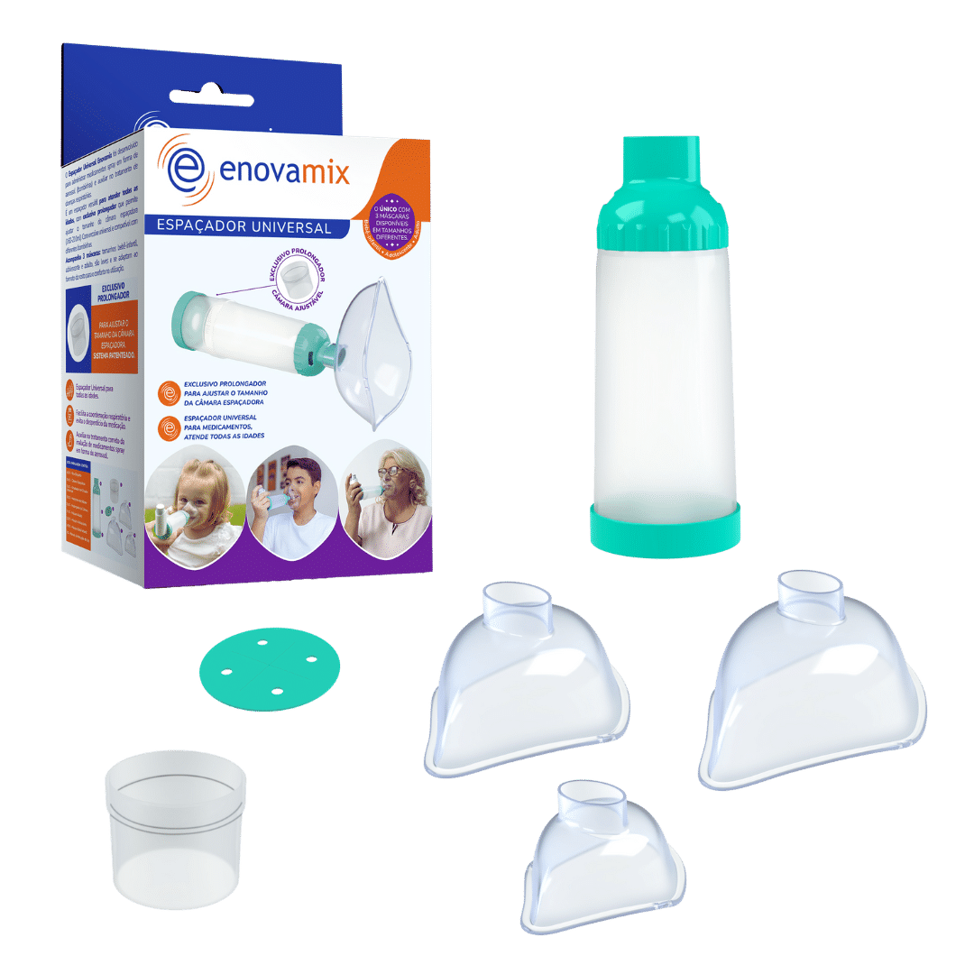 O Espaçador Universal Enovamix foi desenvolvido para administrar medicamentos spray em forma de aerossol (bombinhas) e auxiliar no tratamento de doenças respiratórias. É um espaçador versátil para atender a todas as idades, com exclusivo prolongador que permite ajustar o tamanho da câmara espaçadora (160-210ml). Com encaixe universal e compatível com diferentes bombinhas.