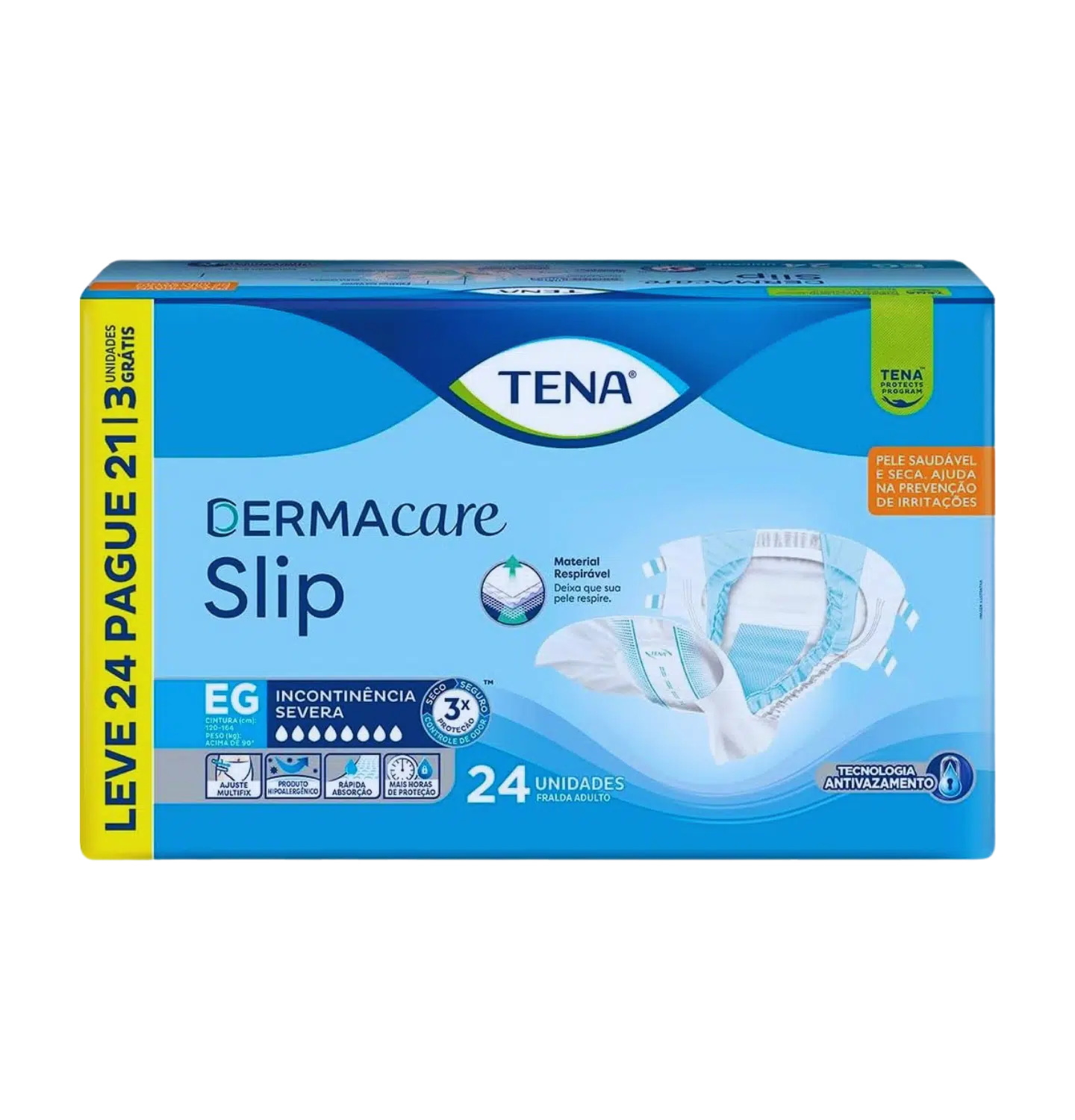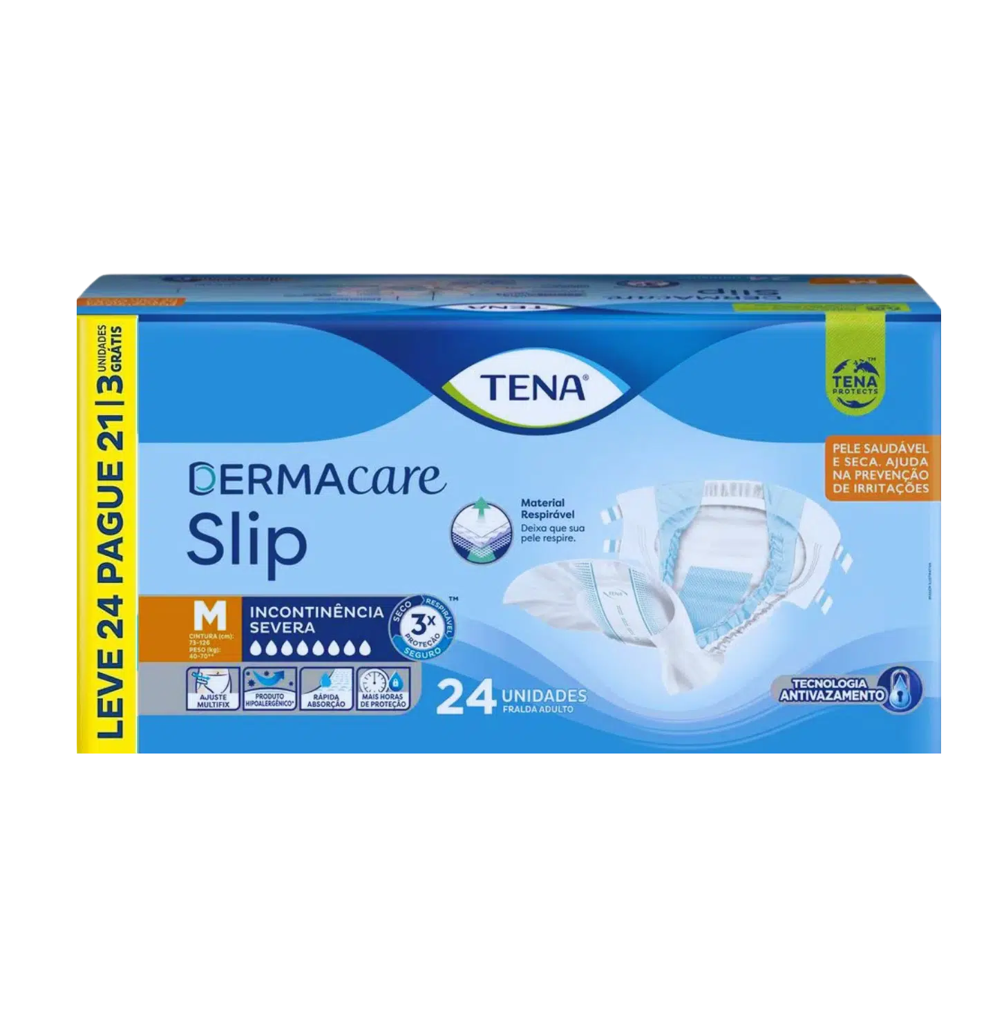 A fralda Dermacare Slip é indicada para incontinência severa, proporcionando proteção ajustável e confortável durante o dia e a noite.