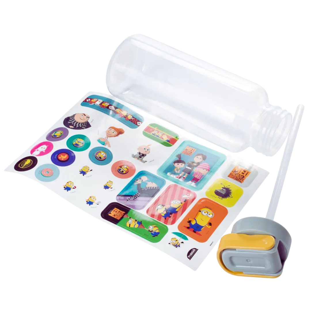 Nosso vilão favorito retorna em “Meu malvado favorito 4” com a família completa: ele, Lucy, Agnes, Margô, Edith, os Minions e Gru Jr. Você está pronto para mais uma aventura com eles?. A garrafa fun com canudo de 600 ml é possui uma cartela de adesivos para que você possa custumizar seu produto como preferir.