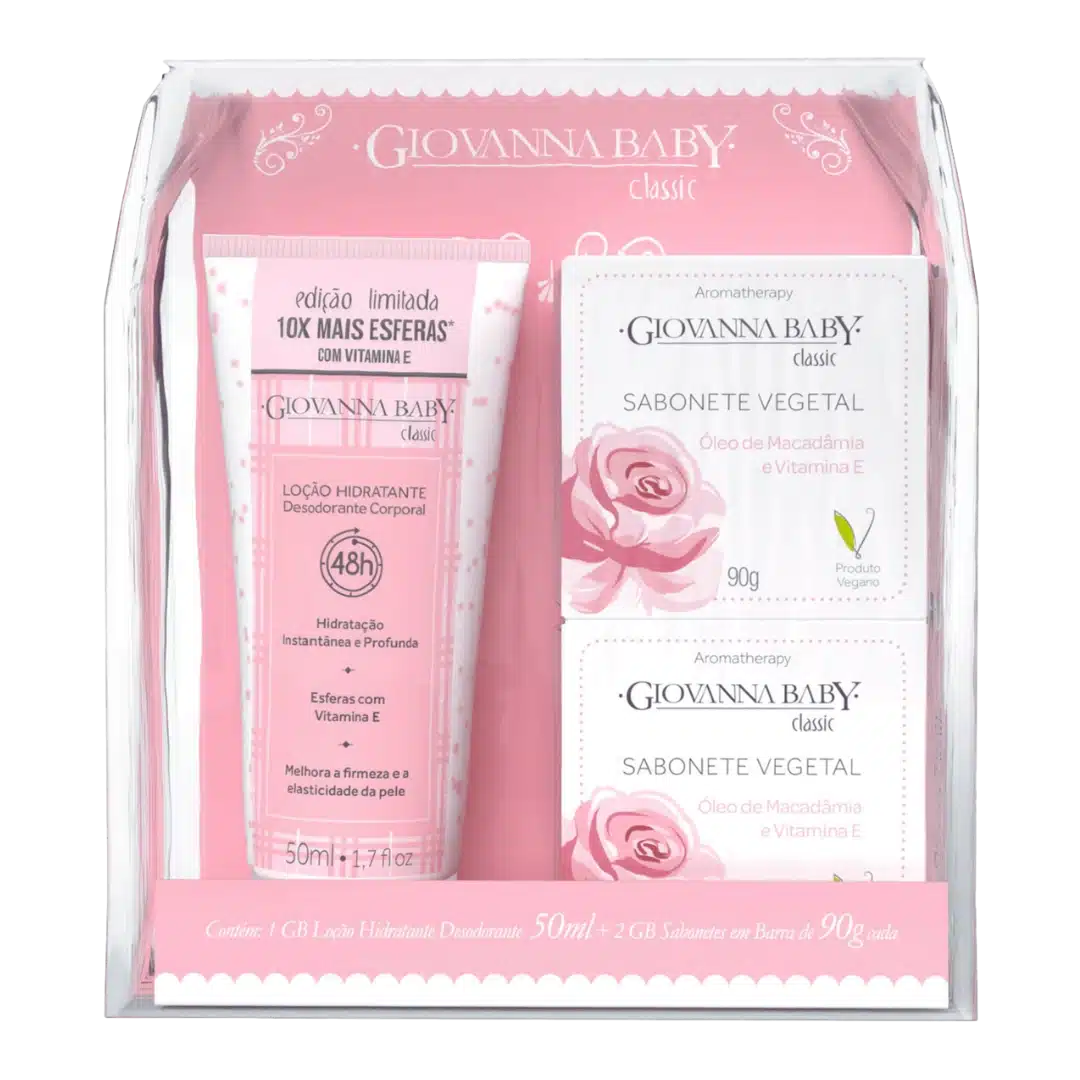 O kit Giovanna Baby Classic contém uma mini loção hidratante de 50ml e 2 sabonetes em barra de 90g, em uma embalagem presenteável super especial.