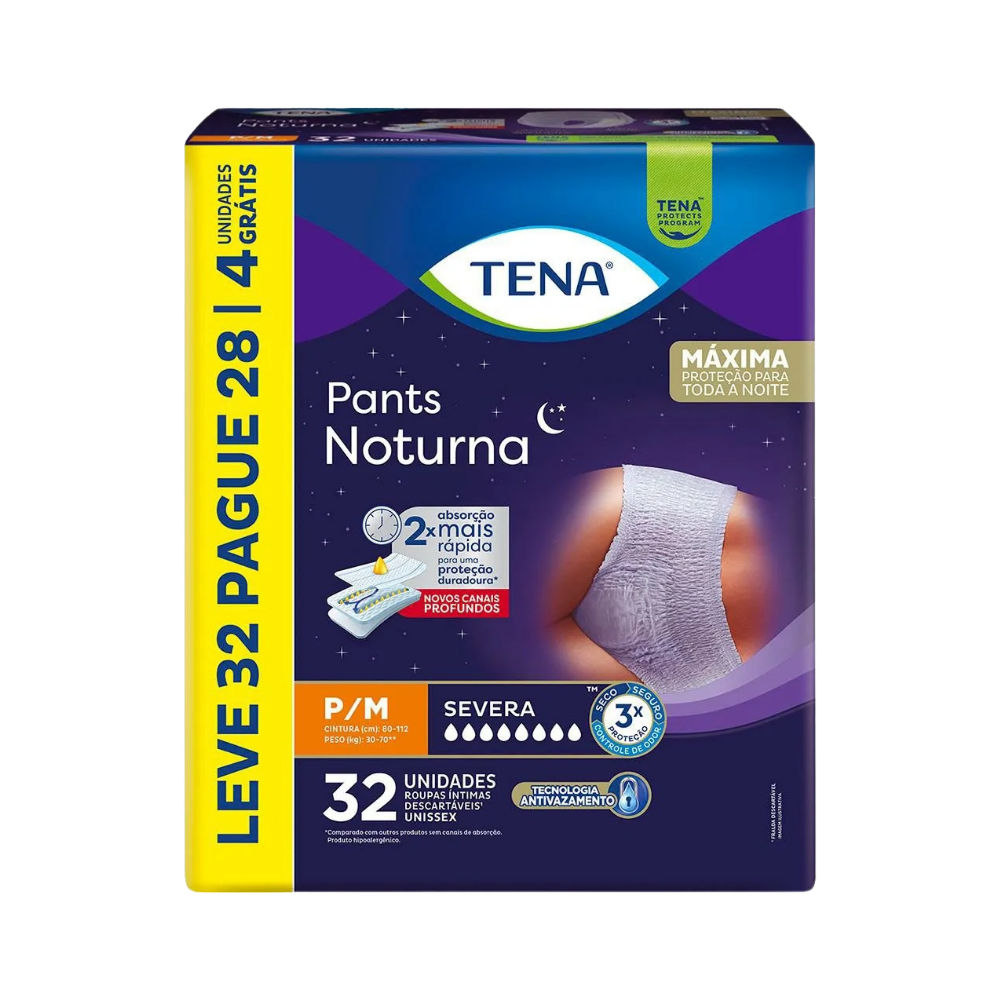 A Roupa íntima Tena Pants Noturna é uma roupa íntima descartável e unissex de rápida absorção, proporcionando ao usuário máxima proteção durante toda a noite. É indicado para pessoas com mobilidade e com perdas de urina severa. Além disso, é muito confortável (elásticos suaves em volta da cintura permitindo uma adaptação perfeita ao corpo), segura e de fácil uso, como uma roupa interior (calcinha ou cueca).